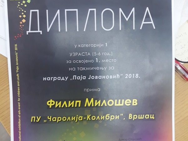 Велики је број изложених радова ученика наше школе а прву награду у категорији узраста 5-6 година добио је сада ученик I- 2 Филип Милошев за рад “Патролне шапе” који је послала његова васпитачица Катарина Поповић . Честитамо Филипу и свим ђацима чији су се радови нашли на изложби.