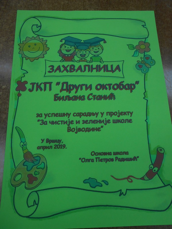 У току реализације пројекта ,,За чистије и зеленије школе Војводине “ расписан је литерарни и ликовни еко-конкурс на тему ,,Чувајмо природу – природа ће чувати нас “. На конкурс се одазвао велики број ученика . У уторак 21.05.2019. године , у свечаној сали школе , педагог школе Вера Бућинац уручила је похвале и захвалнице ученицима и установама које су сарађивале у пројекту. Следећи ученици су награђени и похваљени :