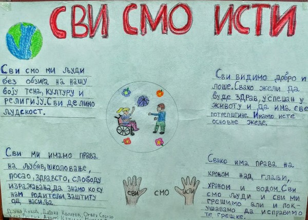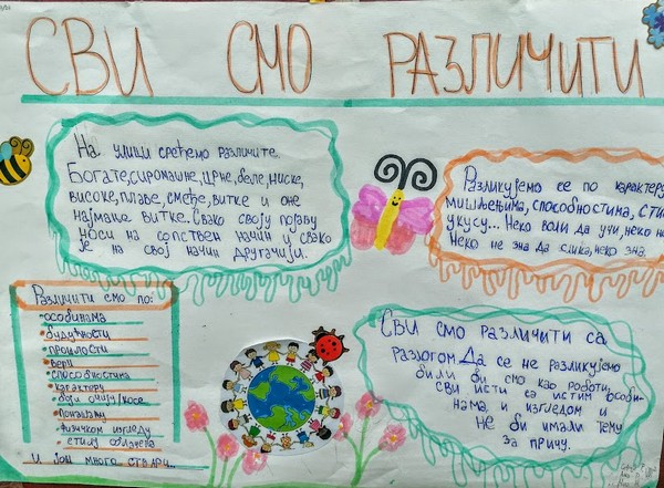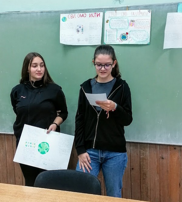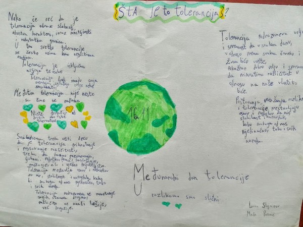 Ученици VII-2 са одељенским старешином, професорком Снежаном Лончар, обележили су 16. новембар Међународни дан толеранције радионицом на тему “У разликама смо слични”. Ученици су подељени у четири групе. Свака од група група имала је задатак да објасни и презентује одељењу по једну тему: