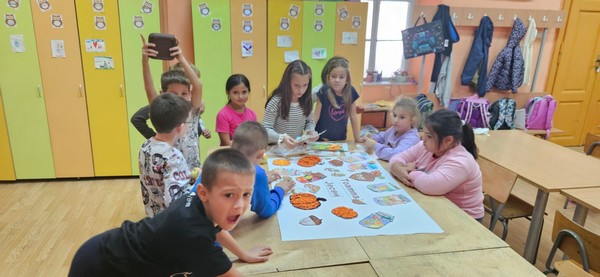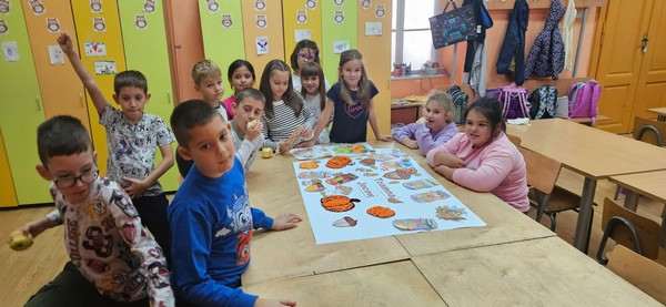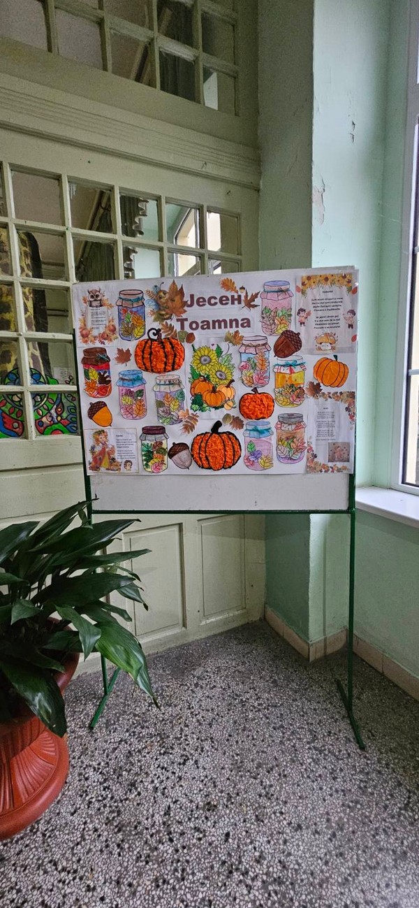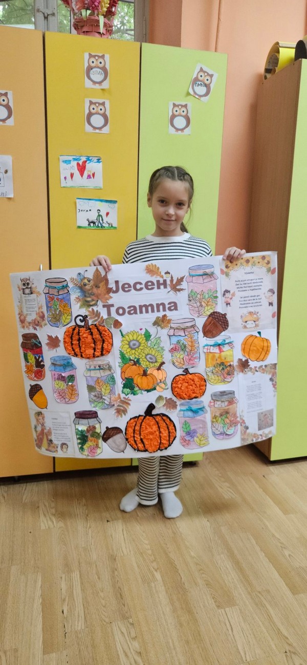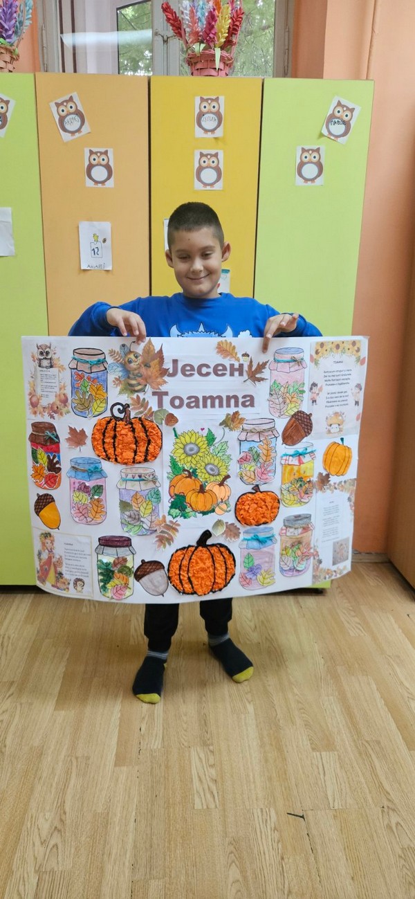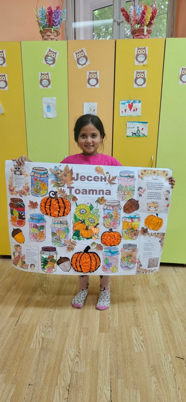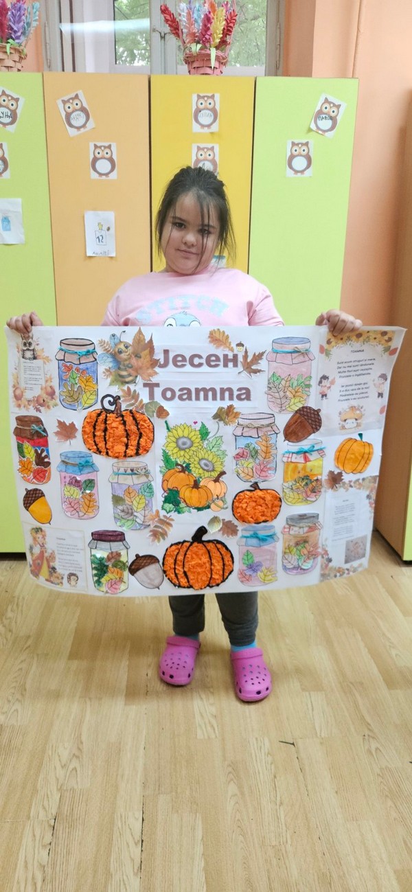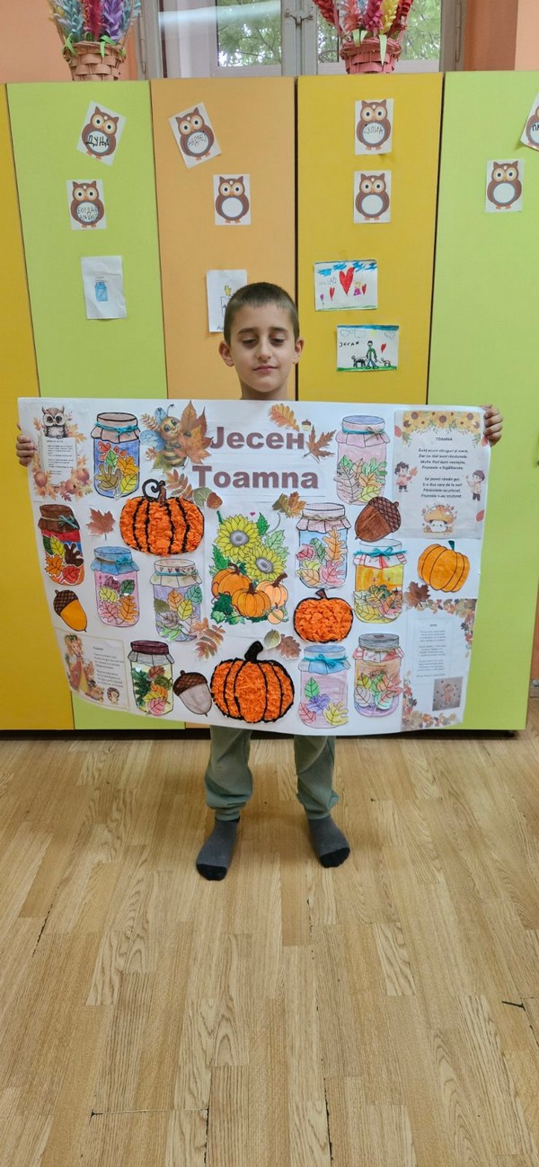 Јесен је стигла и у наш боравак, а са њом и много лепих боја и креативних идеја! Заједно са децом вредно смо радили на изради јесењег паноа. Цртали смо, сецкали, лепили креп папир и украшавали разним техникама, уживајући у сваком кораку. Читали смо рецитације на српском и румунском језику и тако још више употпунили јесењу атмосферу.